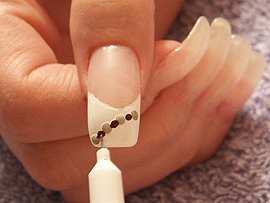 Аккуратно мажем специальным клеем или бесцветным лаком, место куда будем клеить звездочку.